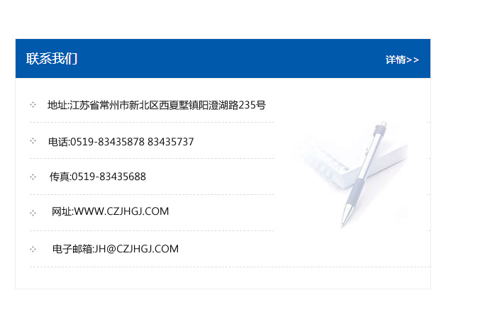 傳真:0519-83435688    郵編:213135    網址:WWW.czjhgj_com.changfangzhuangxiu.com    電子郵箱:JH@czjhgj_com.changfangzhuangxiu.com